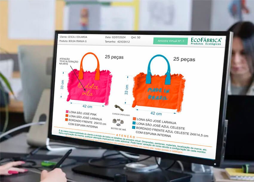 Ao personalizar seu produto é possível alterar ou sugerir cores, tamanho, modelo, compartimentos, materiais e aplicação de estampa.